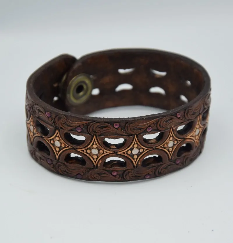Zdobení náramku je vyráběno ručně, vzor je vyražen do kůže raznicí. Kůže je děrovaná. Počítejte s tím, že kůže je přírodní materiál a časem ztmavne. Náramek může mít na přání i jiný odstín barvy (světle hnědá - tan, středně hnědá - brian brown, mahagonová, tmavě hnědá - dark brown, černá). Hrany jsou opracovány a natřeny barvou na hrany. Jako poslední vrstva je použit flexibilní akrylátový lak odolný vodě – top finish. Výrobek je namazán včelím voskem.