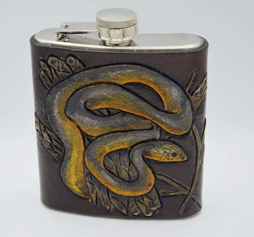 Placatka je potažena obalem z pravé hovězí kůže. Jednáse o ruční výrobu, každý kus je originál, může se mírně lišit od ilustrační fotografie. Jedná se o tradiční ruční výrobu z kůže. Vzor je vytvořen ražbu do kůže. Kůže je přilepena na nerezovou placatici.